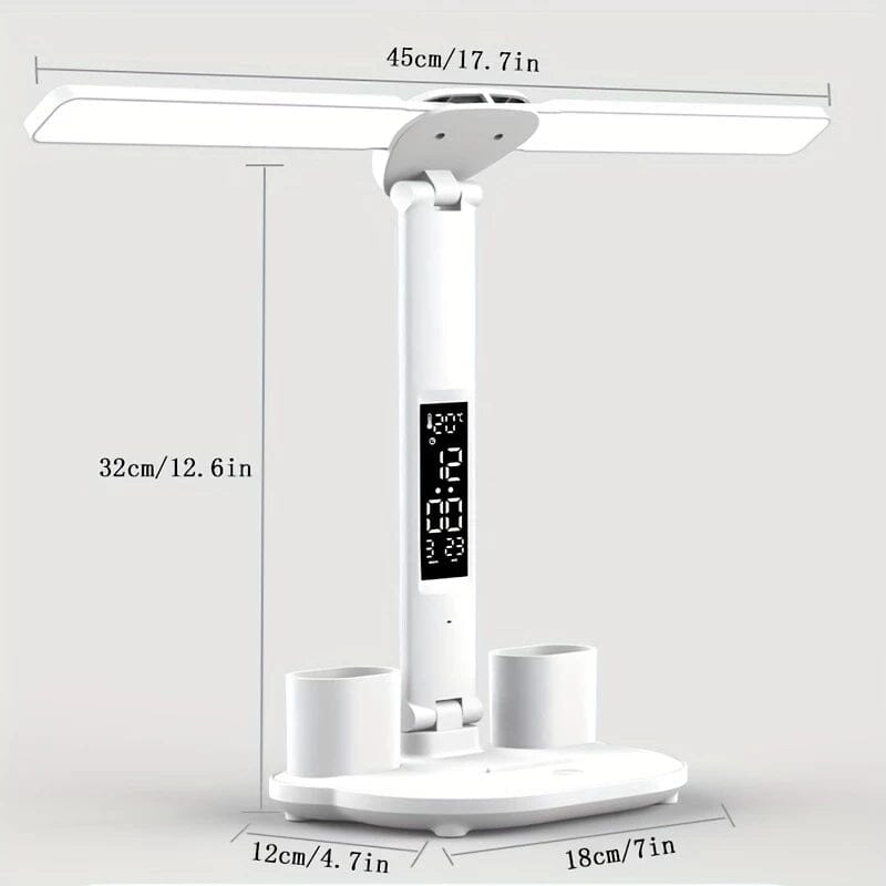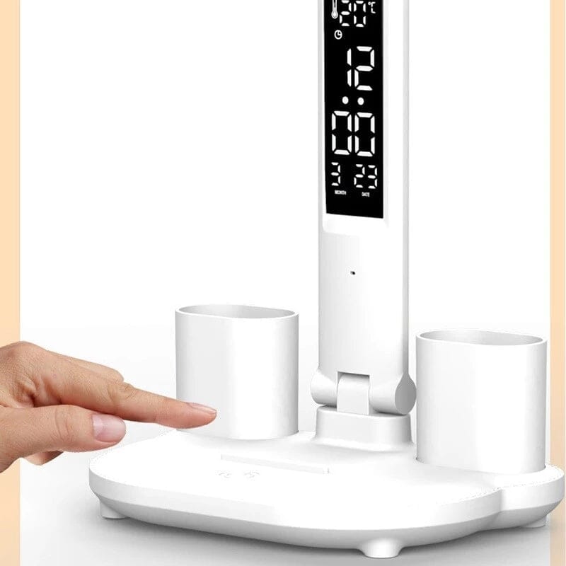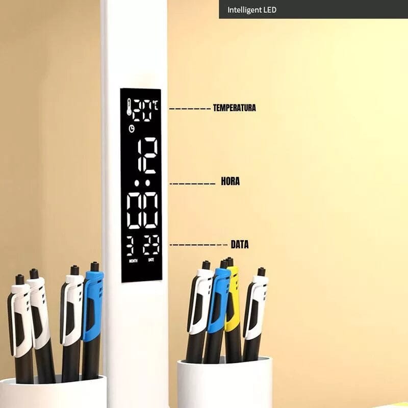 Feito de material de alta qualidade, é ideal tanto para adultos quanto para crianças, proporcionando iluminação confortável e versátil para diferentes ambientes.A Luminaria de Mesa possui uma posição central que exibe a temperatura interna, enquanto os lados esquerdo e direito podem ser usados para armazenar canetas, borrachas e outros itens. Além disso, sua luz não apenas ilumina, mas também clareia a sua mesa de forma prática e eficiente.